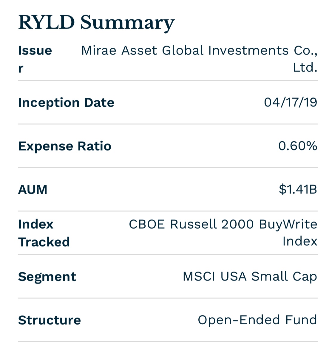 -운용사: Global X -연 운용보수: 0.60% -출시일: 2019년 4월 17일 -배당 주기: 월별 -리밸런싱 주기: 월 1회 -주요 특징: 러셀 2000 지수 주식의 콜옵션 매도 전략을 활용하는 커버드콜 ETF -AUM: $1.41 Billion -추종 지수: Russell 2000 Index (간접추종) -최근 3년간 배당수익률: 21년 약 10.5%, 22년 10.2%, 23년 9.8%